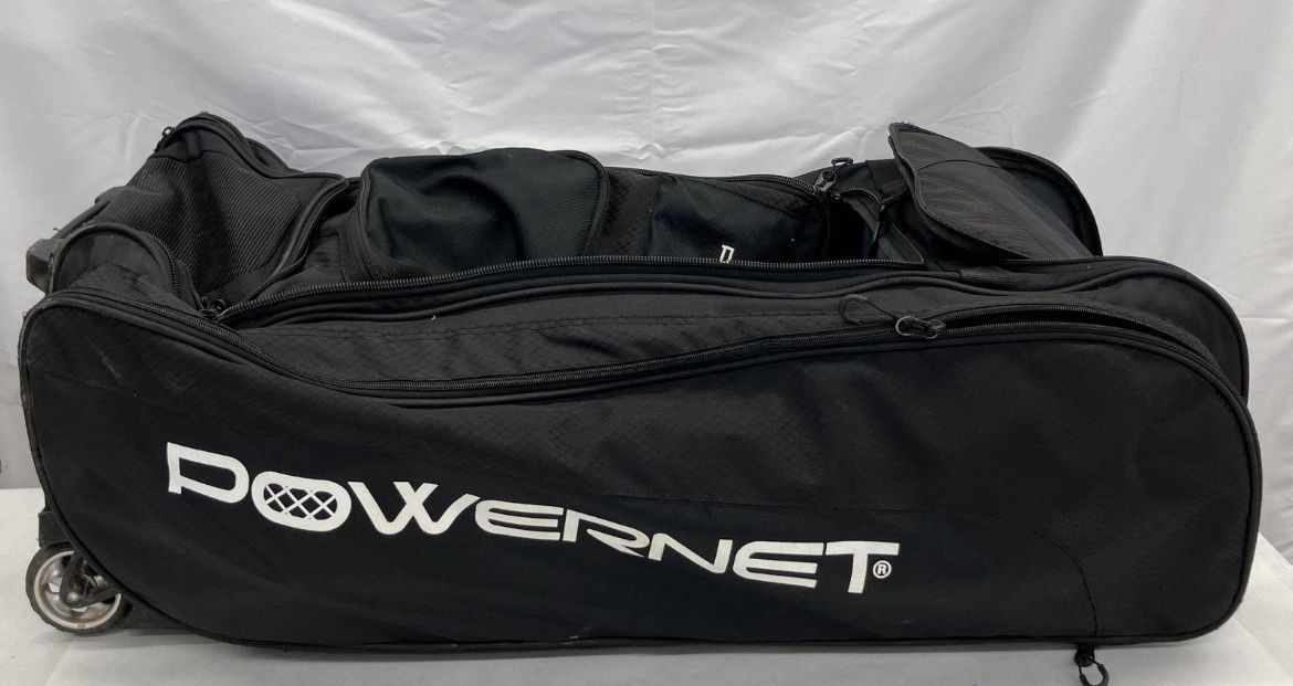 The PowerNet Optimus Catcher's wheeled bag can fit all of your baseball/softball gear and then some into a compact and convenient bag for any practice or on game day. This bag is reinforced along high-stress points to maintain integrity, and support rails are implemented on the back of the bag to prevent tearing. Its large main gear compartment can hold just about anything and everything; catcher's gear, gloves, balls, helmets, and more can all be stowed inside. The main pocket also contains two internal zippered mesh pockets, three accessory hangers, removable shelves with different height options, and two water bottle holders, maximizing storage and guaranteeing the safety of all your gear. The outside of the bag features three felt-lined valuables pockets designed to keep valuables protected, along with fabric strips to attach batting gloves and a ventilated cleat compartment. Five hidden hanging hooks also make hanging the bag on any wall or fence easy while keeping the bag accessible. All-terrain wheels and a telescoping pull handle allow for easy transport to the game. FEATURES: 7 internal bat sleeves 5 heavy duty hanging hooks Removable shelves Ventilated cleat compartment XL full-size main gear compartment All-terrain wheels Telescoping handle Internal mesh pockets 2 water bottle holders 3 felt lined pockets Intended for ages 12+ DIMENSIONS: 40 x 14 x 15 Could use a light cleaning. There are 2 small holes in one outside pocket.