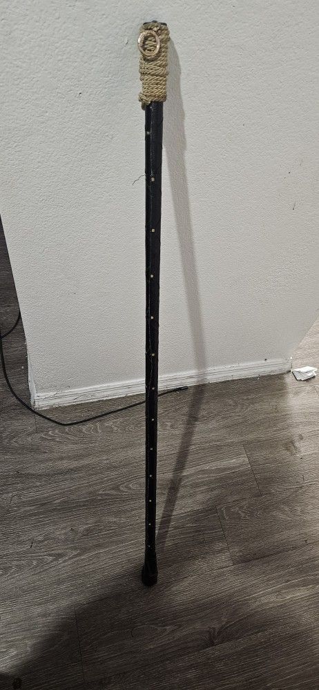 Solid core aluminum wrapped in leather and rope with a finger ring and shock absorbing base