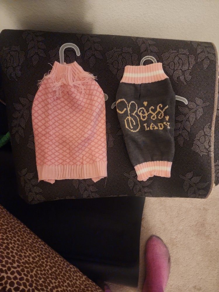 Both are girls clothing, fit middle dog/cat's. My T-cup weight 4-5pd, its to bog. Therefore it will fit a 6-7pd Dog/Cat🐈🐶 . Colors: Pink & the othe Grey/Pink & Gold.