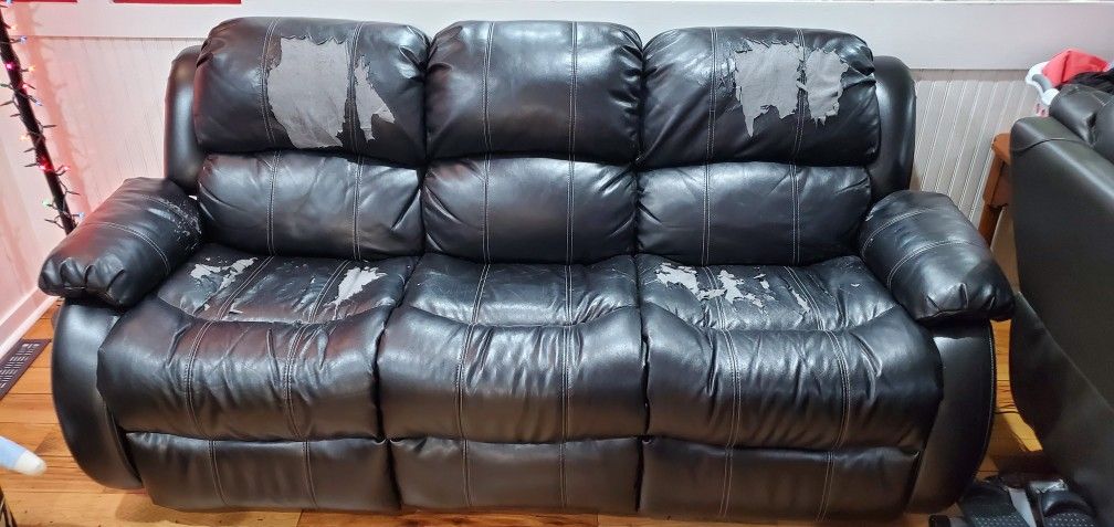 3 person recliner couch, FREE. This couch is very comfortable and reclines pretty far back. Only thing wrong is it is peeling but you could put a sofa cover on it and it would be fine. Must pick up on or before March 1st, as I'm moving. I cannot help move the couch so please come prepared. First come first serve. 85" Wide 40" deep 37" high