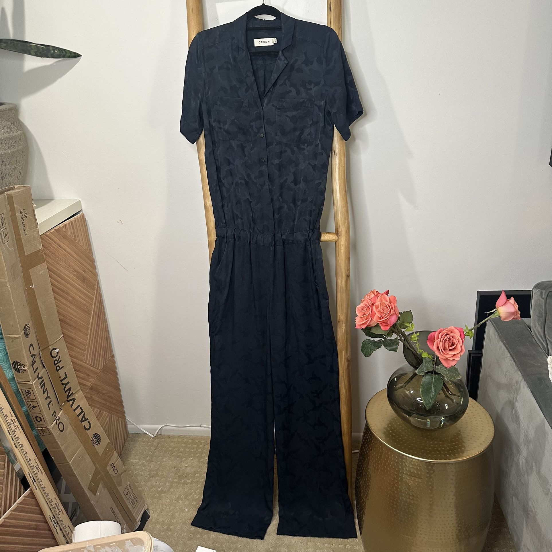 CEFINN Navy blue Spencer jacquard satin jumpsuit. Size 6. This jumpsuit is so cute! The fabric has a very subtle camo pattern in it. It is missing the bottom button, but has a replacement button on the tag. There is a section on the left hip that’s about an inch long where the seem is stretched, it hasn’t popped, & isn’t noticeable at all, but I like to disclose anything I see so you know what you’re getting. The bottom of the hem on the pant leg has light wear as well. All shown in photos. Other than that this is a beautiful full piece in good preowned condition. Great for fall! *located right by fashion valley mall *cash or Venmo