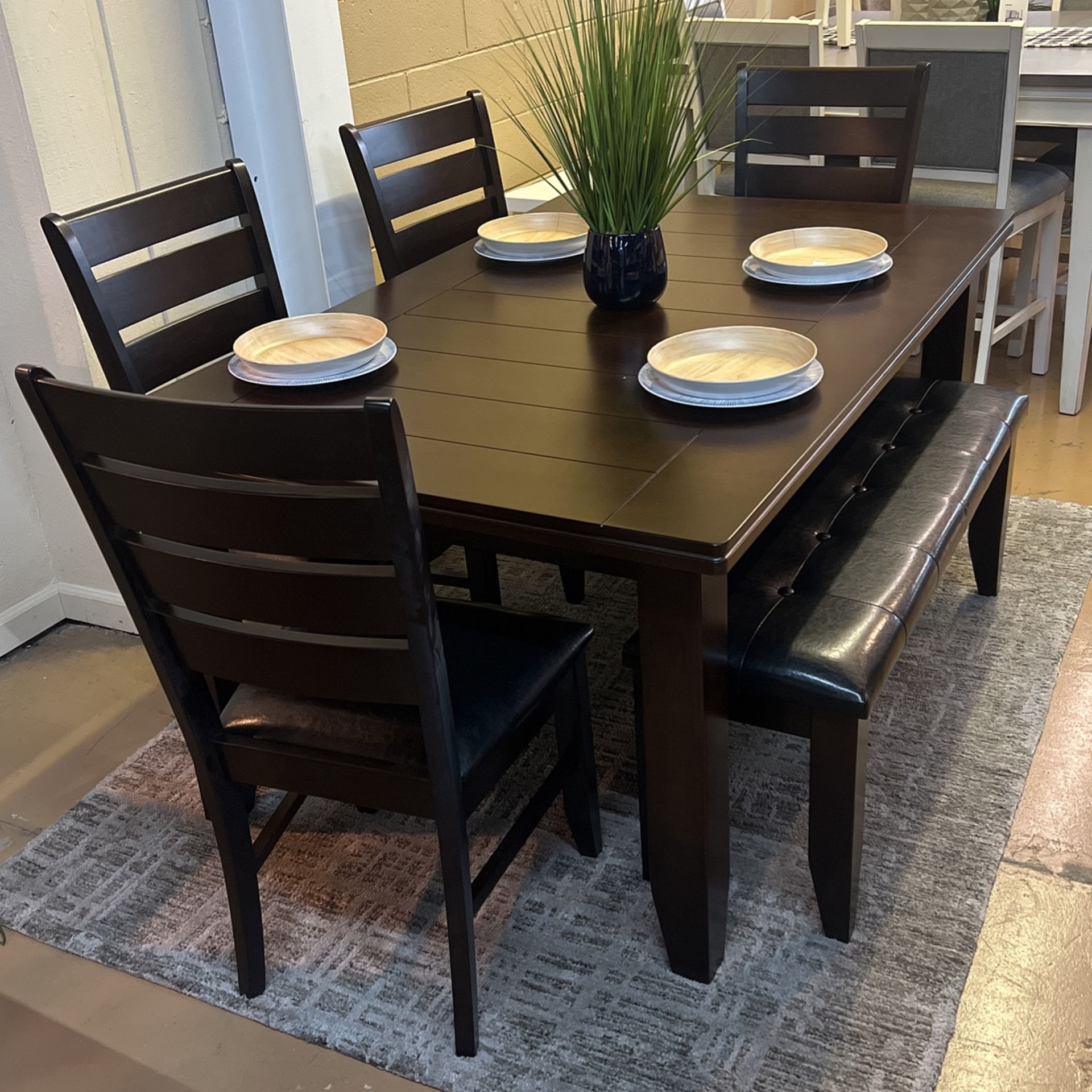 Beautiful table with 4 chairs and a bench. 👉 Mariem Furniture Inc. ✔️ 3124 McHenry Ave, Modesto California We have financing available for everyone! Send me a message to send you a link to apply for financing!! Hablo español.