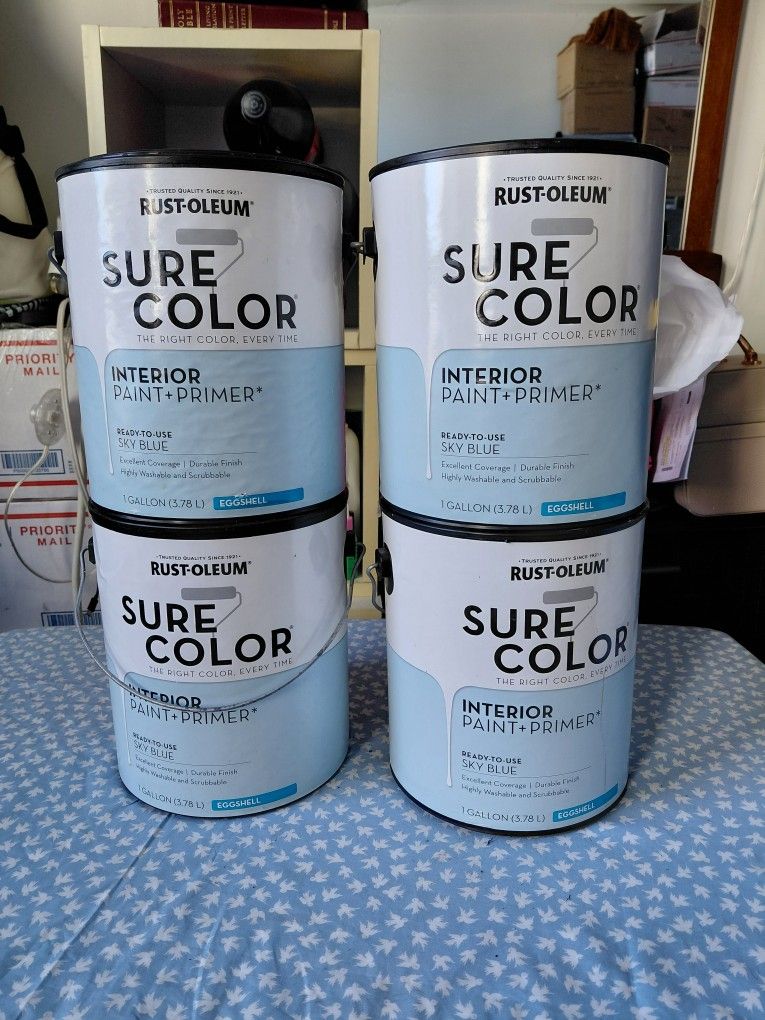 4 cans of sky blue eggshell Rust-Oleum Sure Color Paint. Lowest price it sales for is $34.97 . Im selling it for 20 dollars a can or all 4 for 80 dollars. For all 4 that is a 76 dollar savings.