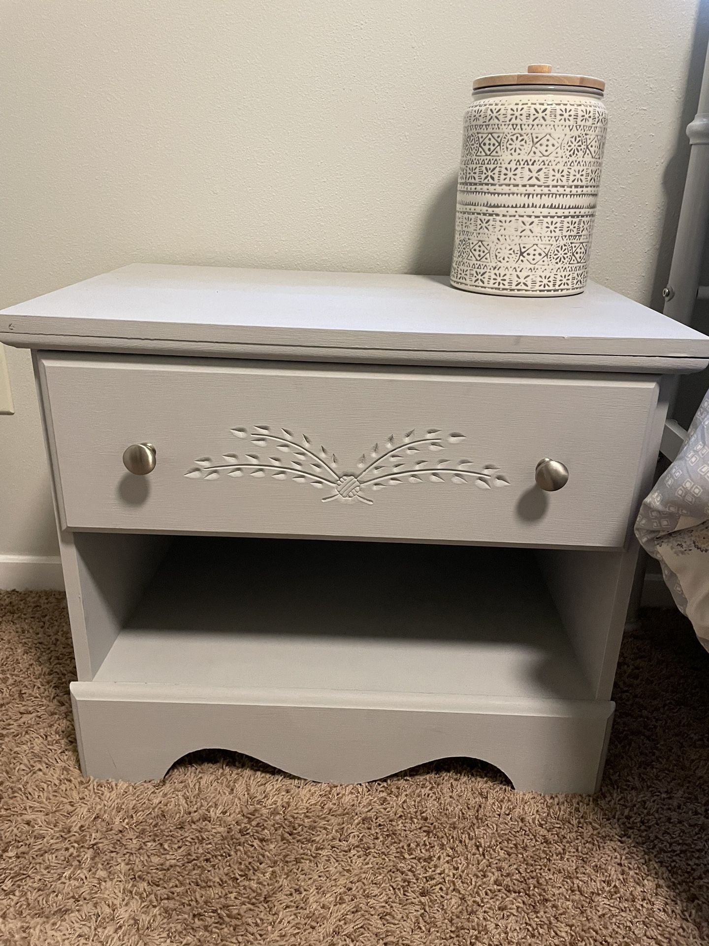 Used, chalked painted light gray, solid wood night stand. Great condition, but could use a new set of paint. Wear on top of dresser.