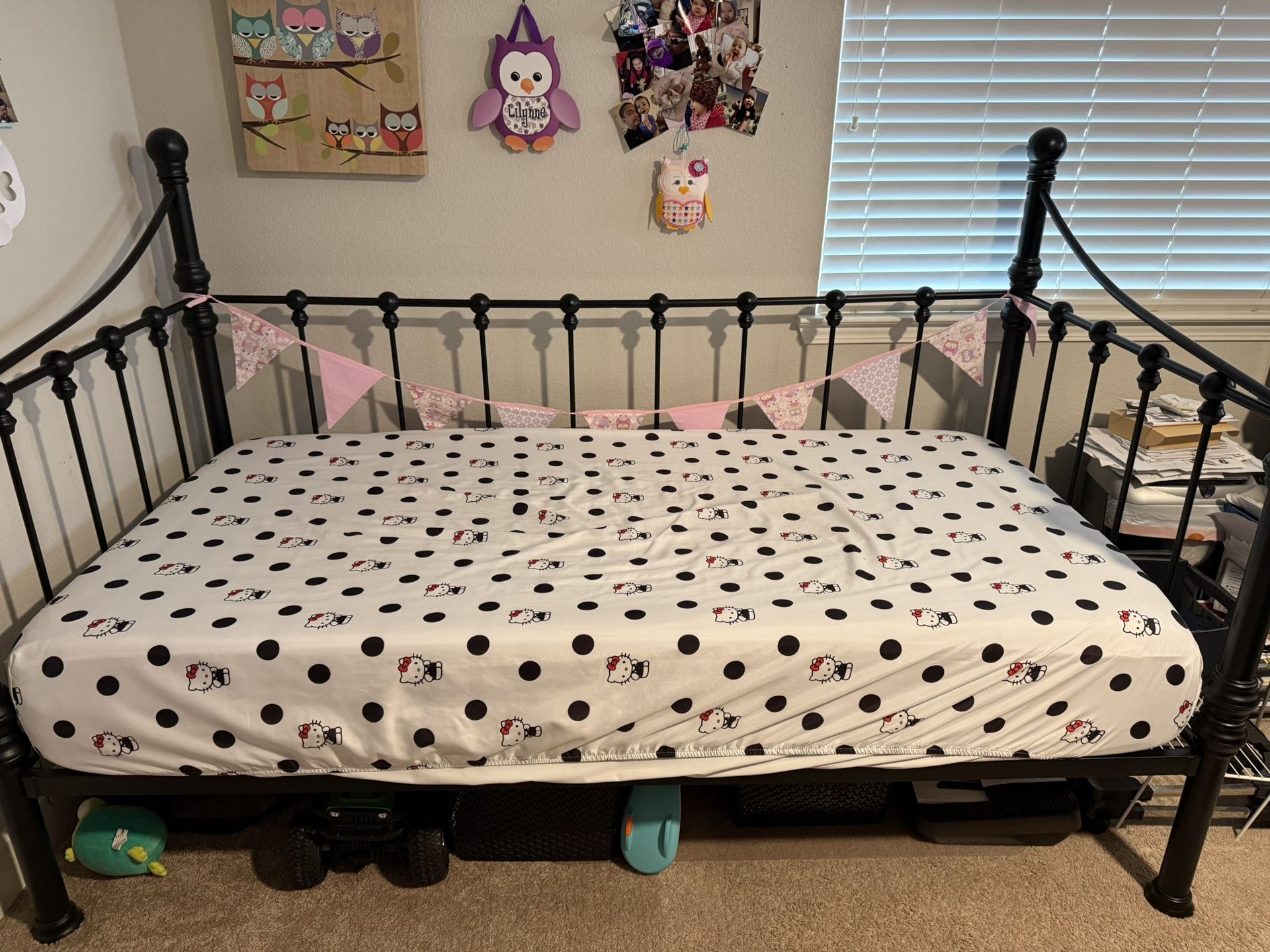 Gently used toddler/young child/teen, Twin size daybed Very sturdy and built to last We removed one decorative bar at top, therefore it is not displayed in photos and will not be included. Easy to assemble and disassemble Rear posts stand 51 inches high Front posts stand 41 inches high 42 inches x 81 inches from edge to edge 11.5 inches of clearance under bed MATTRESS NOT INCLUDED