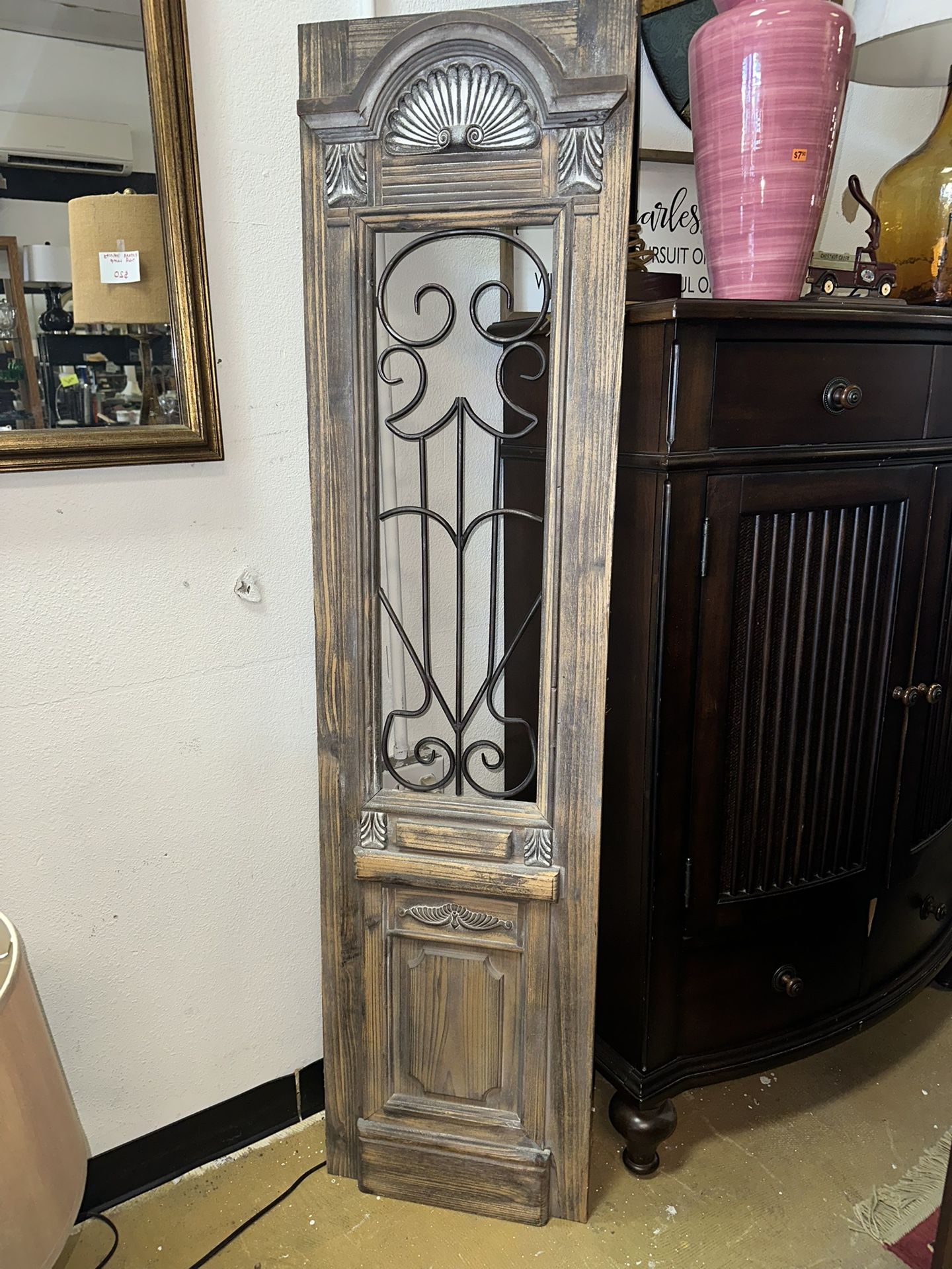 Wooden antique shutter with wrought iron heart shaped details. Beautiful French country wall decor with hanging hooks already installed.