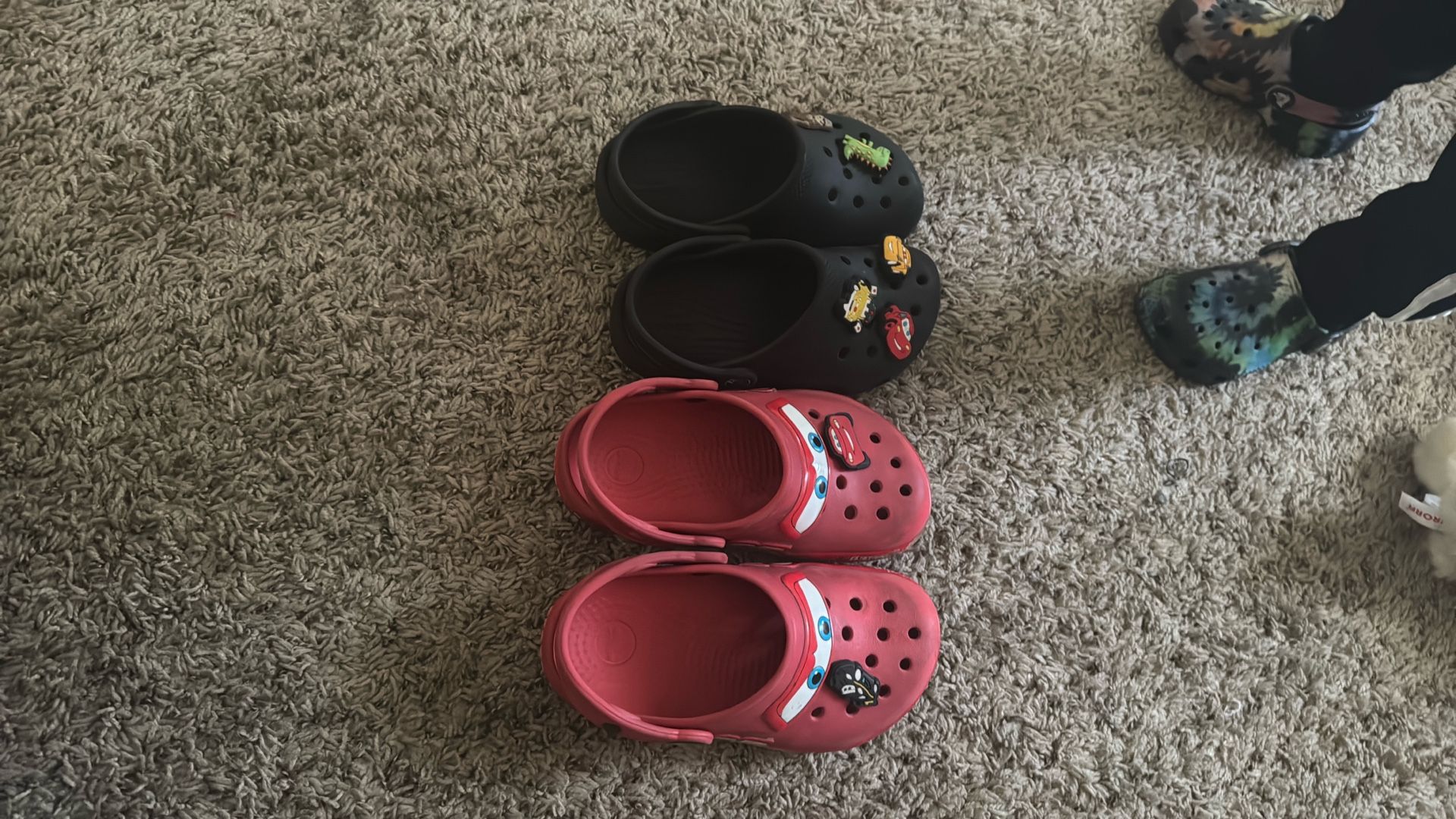 Boys crocs the black ones are a size 10 and the red lighting mqueen ones are a 12 with charms I’m asking 20$ and 15$ for the black . In good condition worn