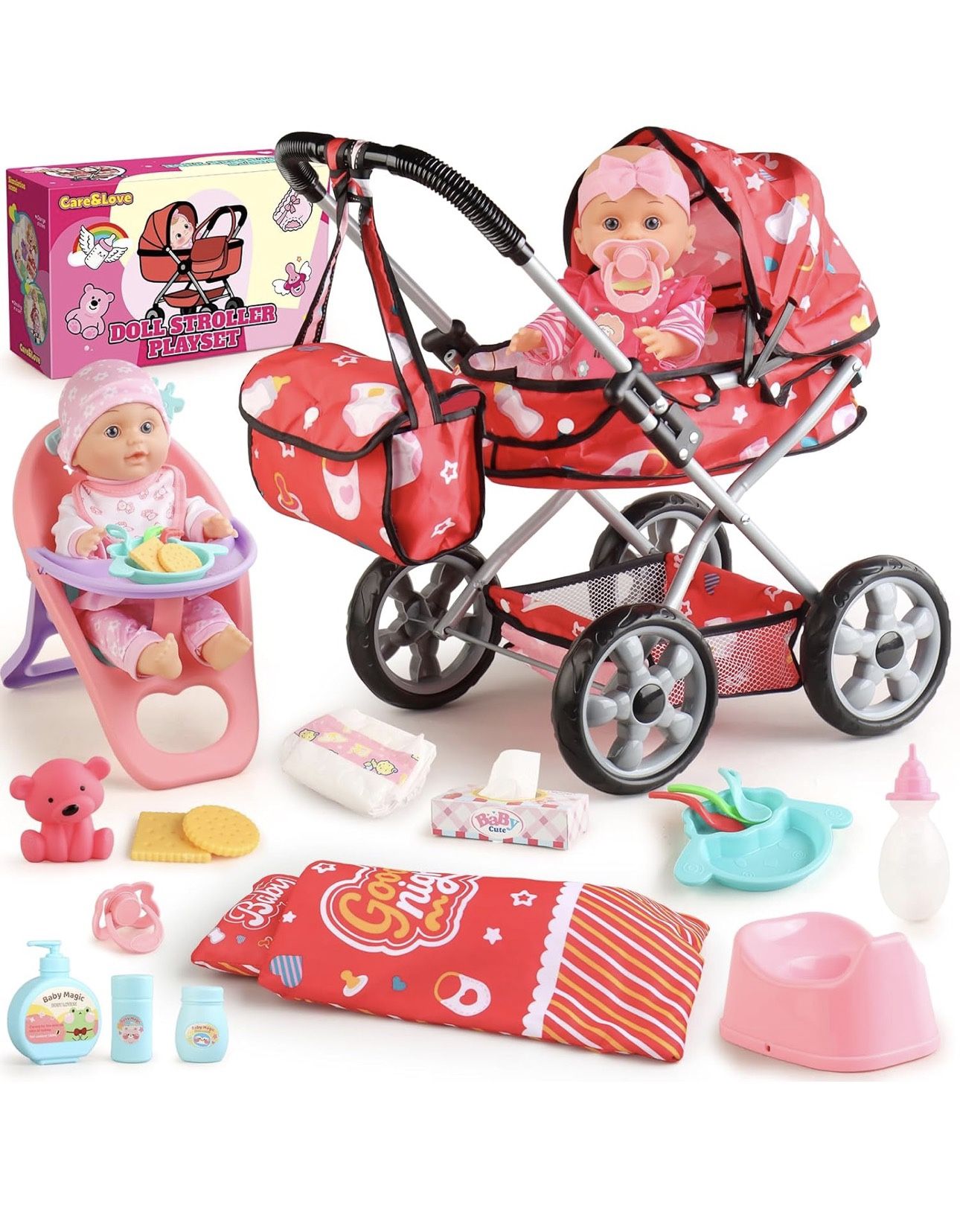 New-Baby Doll Stroller Set for Toddler Girls 3-5, A 12.5" Babydoll with Baby Doll Accessories, Pillow, Blanket & 2 Sets Clothes, Doll Playset Toy Stro