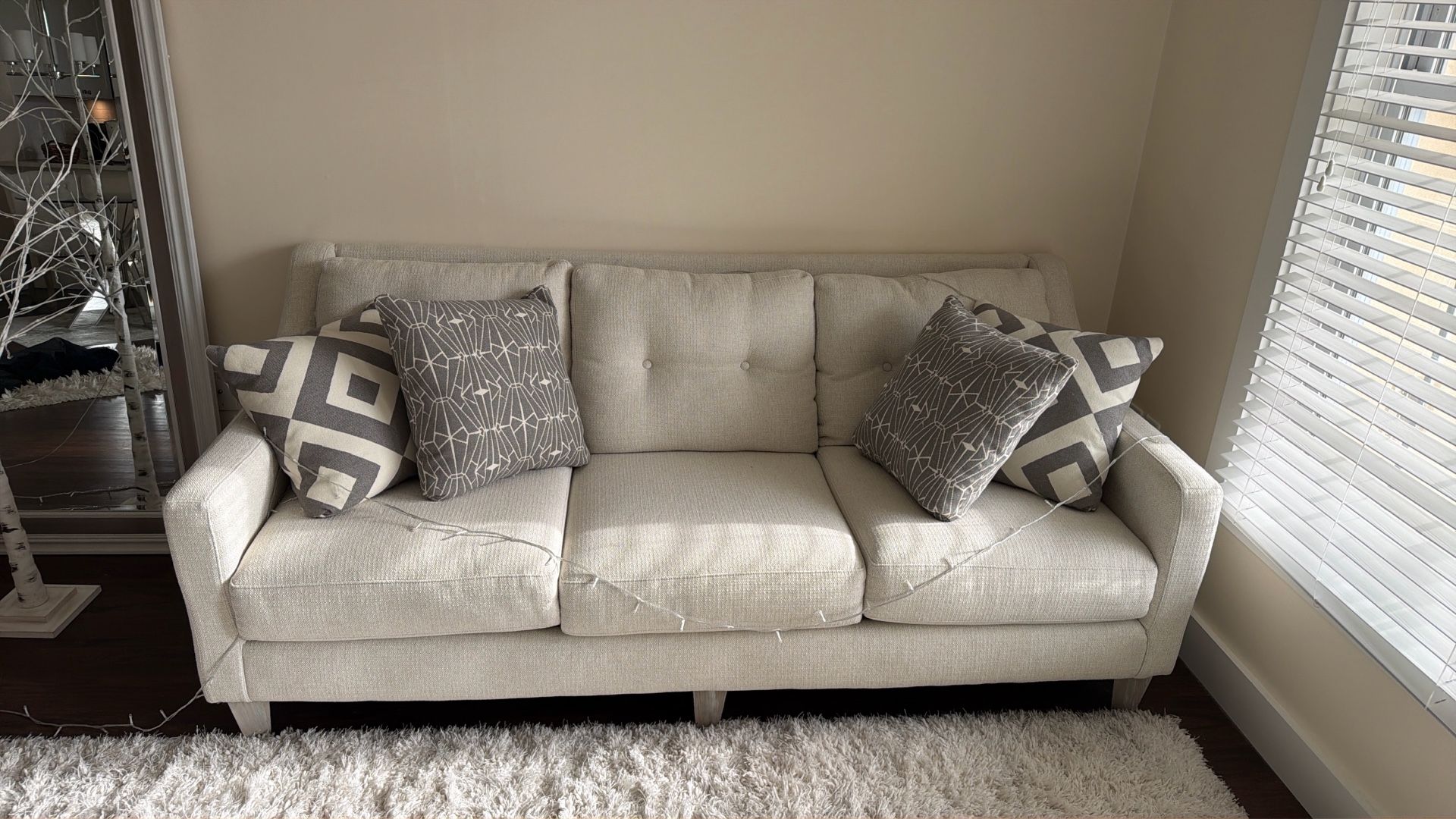 Large couch $300 Small couch $200 Coffee table $100 Sideboard $100 Two lamps $50 White rug $100