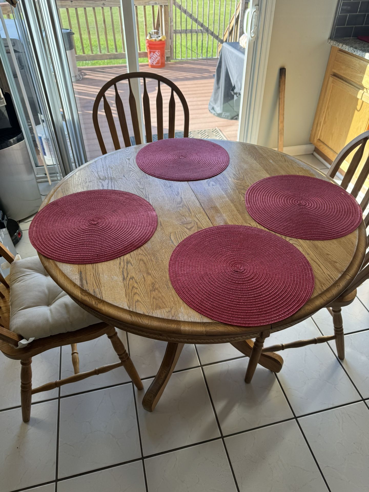 Table with three chairs all wood very sturdy it even extends with a centerpiece to make it from a circle to an oval really good item