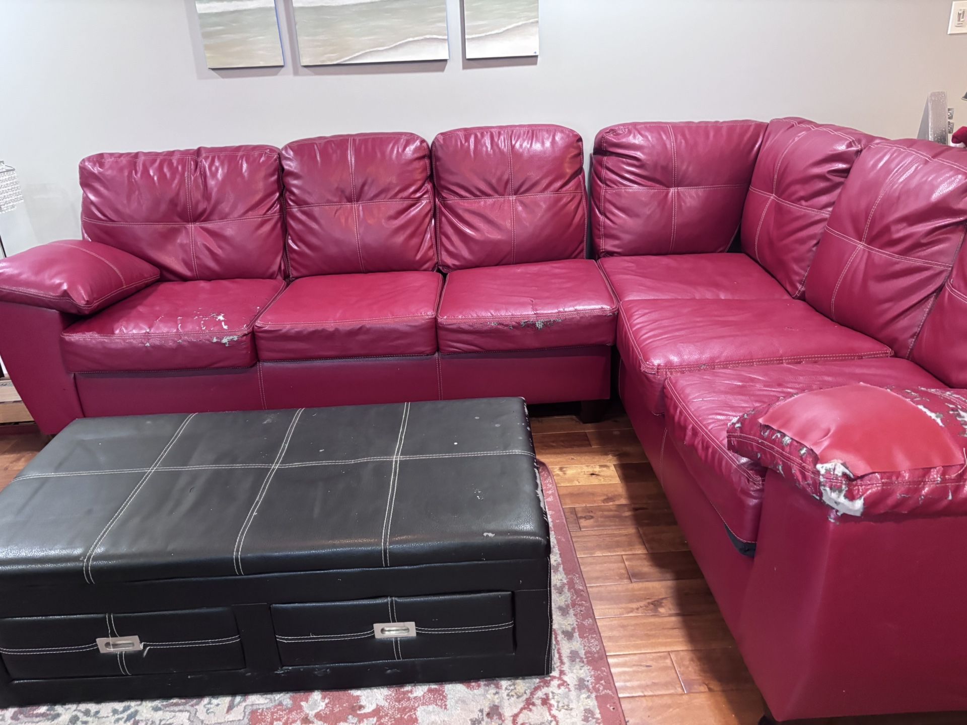Well used 2 piece sectional red vinyl sofa. Structurally good and solid but vinyl is cracking terribly on one armrest and slightly on a few cushions. The coffee table also shows wear but solid working structure. Black vinyl.