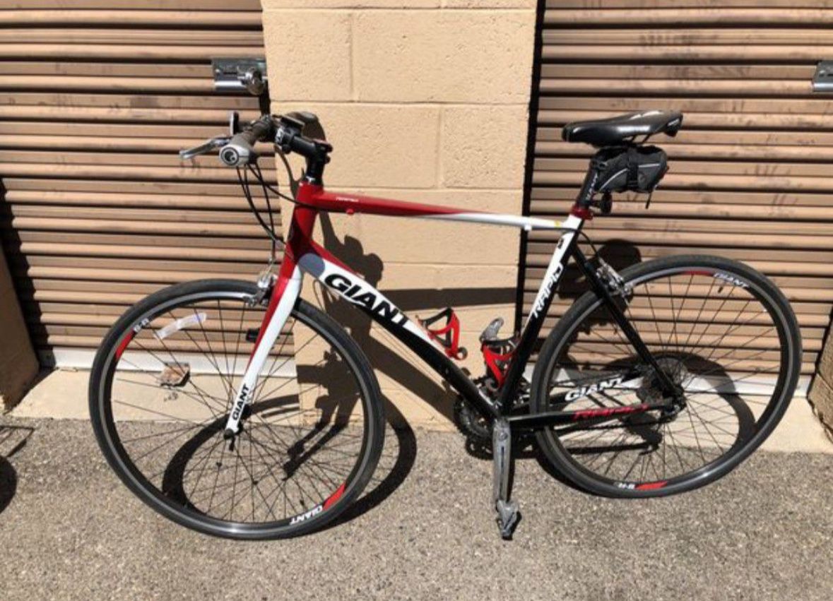 Giant road bike frame is Large. Really nice bike with some after market parts.. new handle bar, seat and carbon fiber cup holder. Comes with specialized helmet valued..
