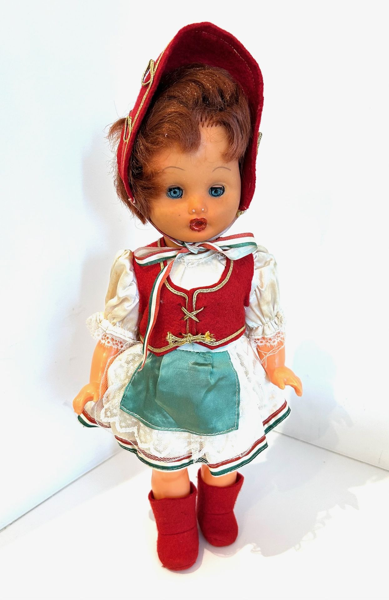 Vintage Hungarian Doll 17”, Rubber Face, Plastic Body, Red Hair Smoke free home/ pet free home Some wear due to age to face, eyes, hair, and clothing as you can see in the photos