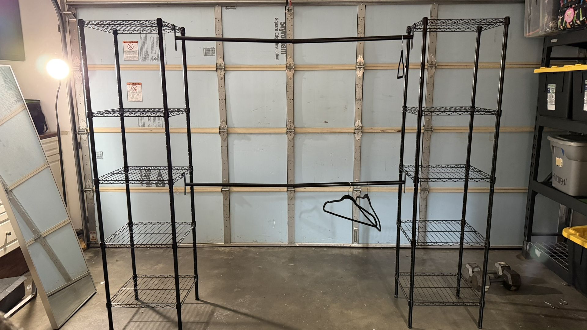 4’11- 6’10 adjustable closet , and adjustable shelves you can make it smaller or longer. Steel frame finish. Easy assembly.