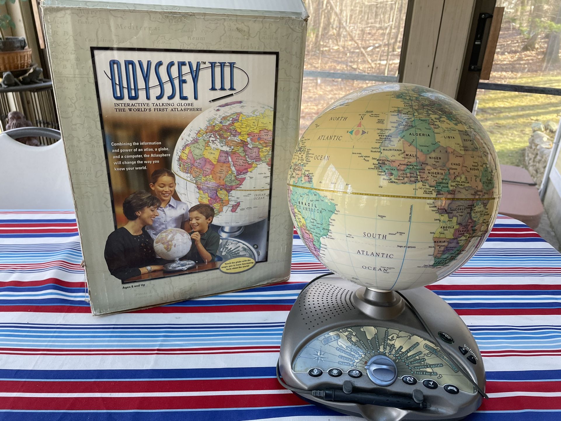 Odyssey III Globe Interactive Explorer Globe. Appropriate for Ages 8 Years to 10 Years. Touch the interactive pen any place on this interactive talking atlas and learn thousands of amazing facts. Compare population and land area between say Dundee Scotland and Oaxaca Mexico. Find out flying times between Lubbock Texas and Kyoto Japan. Learn fascinating facts about continents countries capitals music currency highest points and so much more. Features: -Clearly speaks geographical information with a touch of the stylus -Compares populations and land areas between locations -Tells distances between points – even estimates flight time! -Plays national anthems and popular songs -Identifies continent name, population, land area, highest point