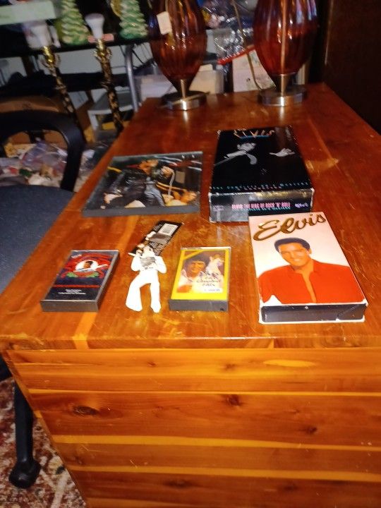 6 items. 1. 50s Masters nevervplayed. 2. Elvis photo dressed in black.3. Life Story VHS. 4. 1 Hanging Decoration. 5 % 6. 2 Tapes. I also havecElvis on Wood not listed here. All for $80. Elvis on wood is $250. Taylor pick up.