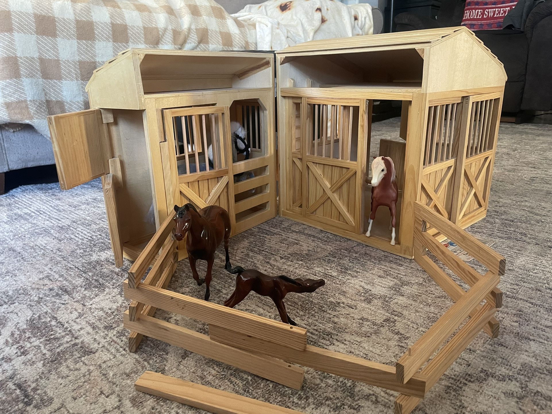 Melissa and Doug solid wood stable/barn with fence and four horses! Fence has some slight damage and one broken piece (see picture) One horse is a collectible Breyer horse! All for $50