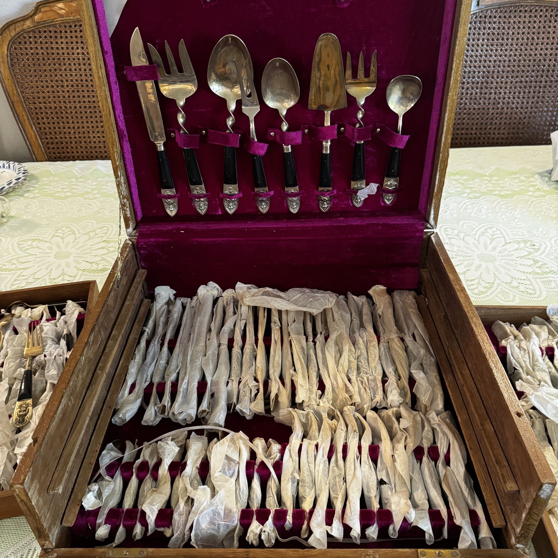 About 144+ pieces . Cutlery sharp and wrap on 90% of them . 3 trays plus serving under lid. Comes with box.