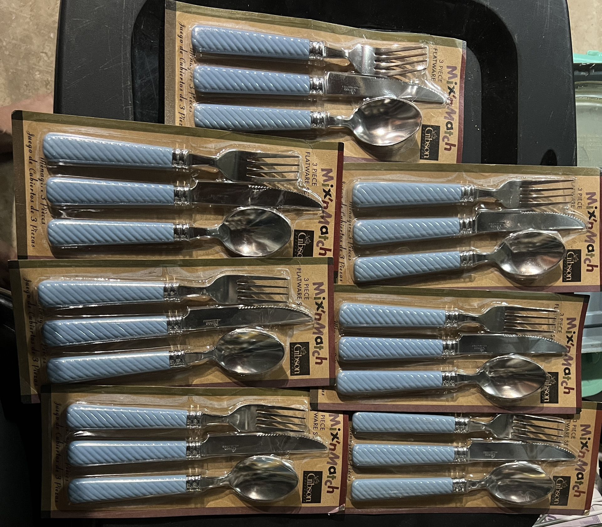 Gibson 3 pieces flatware set. Color light blue I have total 7 packs equal total 21 pieces set all together. Occasion. All Occasions Personalize. No Style Farmhouse Personalized No Finish Shiny Compatible Brand. Gibson Home Character Utility Ware Handle Pattern. Solid
