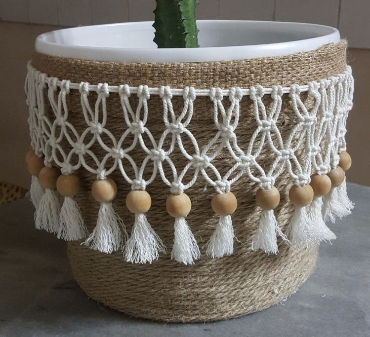 Handmade Macrame pattern Covered with rope and burlap Lined inside with plastic 16” tall 16” round Perfect for artificial plants or hiding ugly nursery pots of live plants