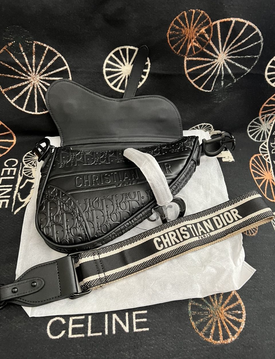 Brand new black saddle bag, 10 x 8 in. in size. Comes with dust bag, no box. Has leather and fabric straps. Magnetic closure. One small zipper compartment inside. Great quality leather. Please manage your expectations. Serious inquiries only!