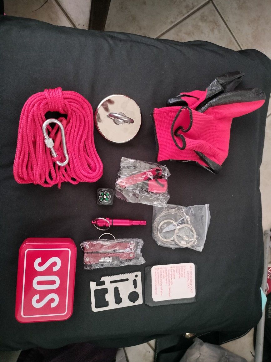 Kit includes 2500 lb fishing magnet, gloves, rope, sos tin includes: Wire saw, 1 multitool, whistle,compass,1 multipurpose pocket survival tool. A must have for any outdoor enthusiast!