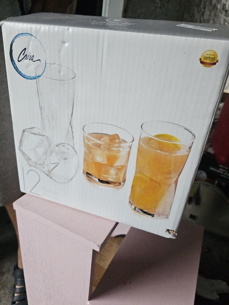 Drinking glasses. Still in box never used. Box has water damage. Glasses are still intact. Full set