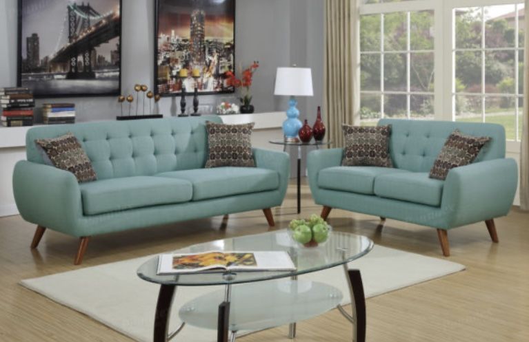 Sofa & Love Seat Item # F6914 Color: Sky Blue Peg-Style Leg Accent tufting Plush seating Accent Pillows Included Available in Grey, Ash Black, and Sky Blue Materials: Polyfiber Plywood + Solid Pine Foam, Fiber Battings Dimensions: Loveseat 60″ x 35″ x 33″ H Sofa 82″ x 35″ x 33″ H