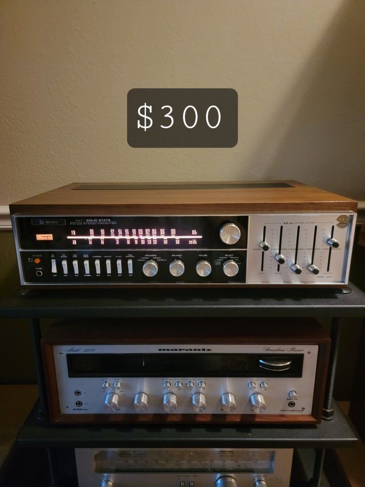 Nivico JVC Model 5003 Stereo. Quite a cool fun little unit. Looks like it's from about 1968 or so and is 50 watts per channel into 8 ohm. Has tone controls with 5 position eq sliders, loudness, low and high filter. I gently blew out the inside with clean compressed air and cleaned all the controls with Deoxit d5 and Faderlube f5. I cleaned the tuner with CRC Quick Dry Electronic Cleaner and lubed all the pivot points of the tuner with Max Pro Electronic Lubricant. I hand rubbed the Walnut Veneer cabinent with Howard Restor a Finish Walnut followed up with Howard Feed and Wax. The cabinent looks really good and is in great condition. The faceplate is in equally good condition. It4 sounds great with all of it's functions working. FM tuner is extremely strong hardly needing an antenna. Has some low level constant static that's hard to hear and does not increase with volume. I test quite thoroughly and listen closely. You may not notice it. Asking $300.