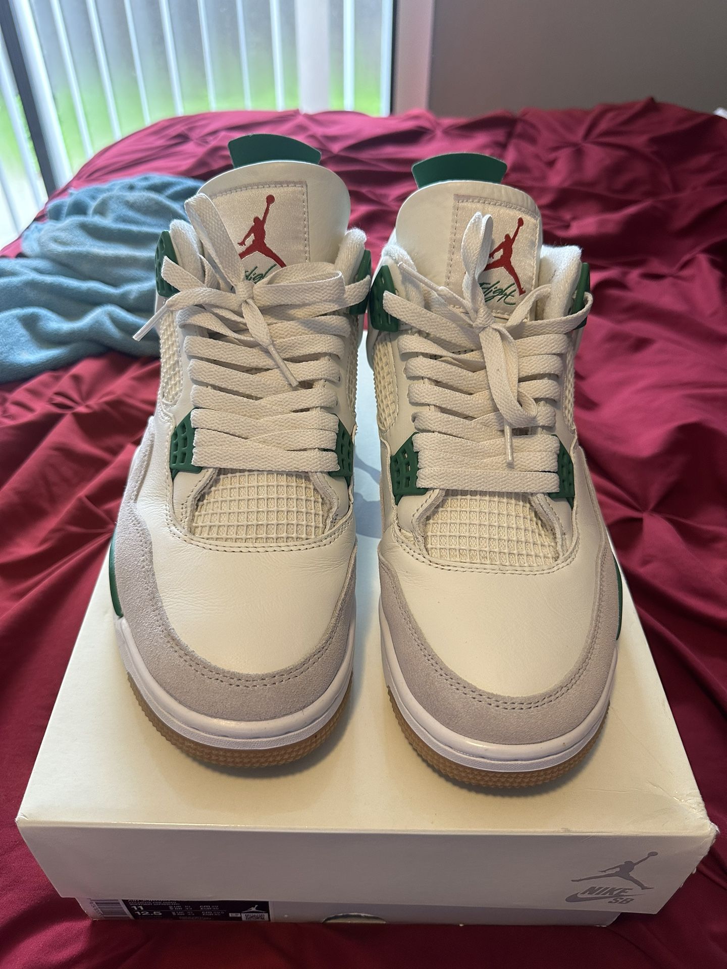Pair of Jordan 4 Nike sb pine green size 11 in excellent condition!! worn once I’m in no rush to sell.. These shoes are 100% authentic not here to waste anybody’s time especially my own prices firm give me interest.