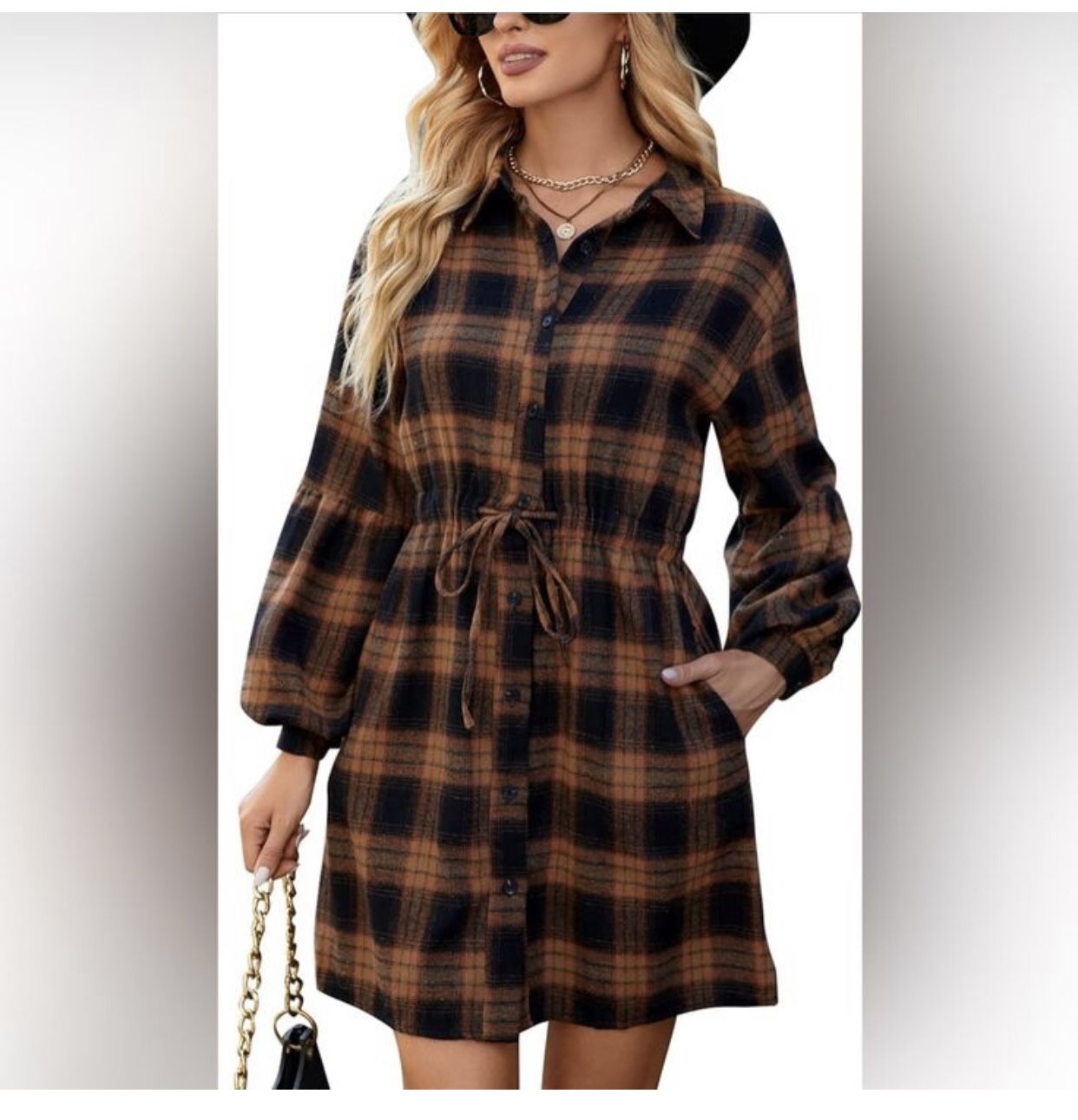 Super soft brown and black flannel dress with adjustable drawstring waist , collar and long puffy sleeves. Knee length. New with tags. Pit to pit: 19” Waist: 16” adjustable Length: 36”. Shoulder to hem