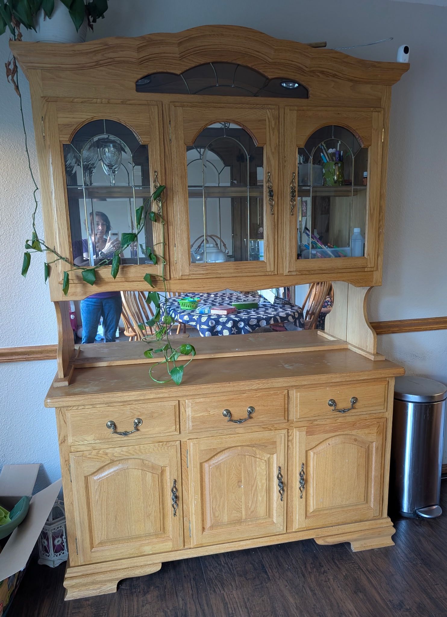 Solid wood china cabinet with glass-front upper storage and lower drawers/cabinets. Sturdy, classic style, and in good used condition. Great for dining room storage or display.
