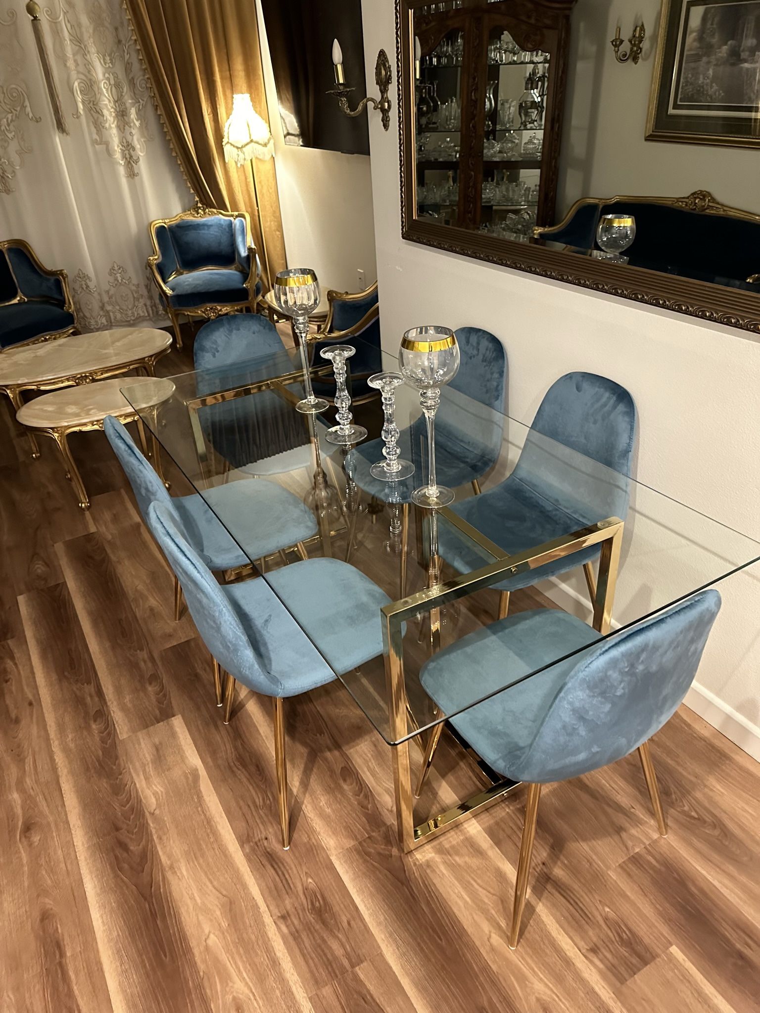 Blue Gold Velvet Glass Dining Set