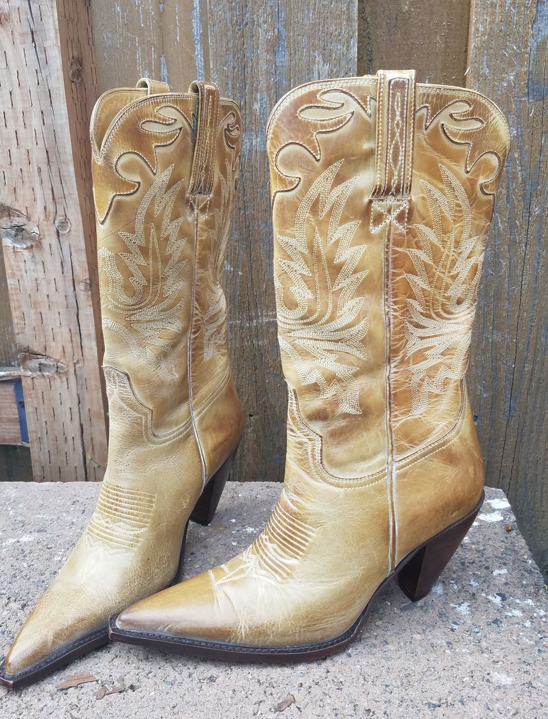 Charlie 1 Horse western women’s cowboy boots by Lucchese size 6 Nice lightly used, very good condition. The boots feature leather uppers, fancy detailed stitching, leather lining, leather soles, stacked heels. Nice quality western boots. Light tan color. I love these, but they are too tight in my ankle and calf. This is a very narrow size 6, feels a little smaller.