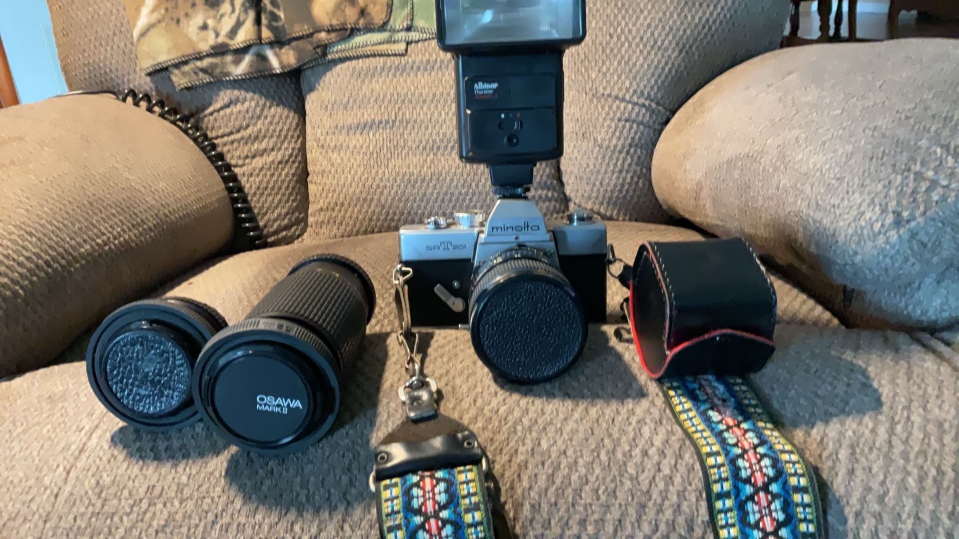 Minolta srT201 camera. Seikanon 28-70 mm Macro zoom, Osaka MC 1:45. 80-200 mm zoom lens,s. AUTO TELE CONVERTER 2X. MD ROKKOR-X 45mm lens, Flash attachment included. All in excellent condition.