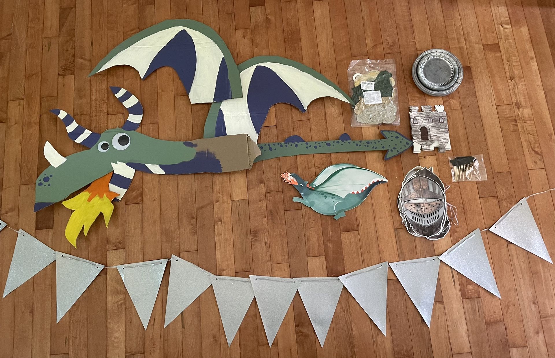 Hello, I have party supplies that are unused and leftover from my son’s dragon and knight party. If you want a specific items message me. Breakdown of items: -1 homemade dragon we made out of cardboard and then painted. We used balloons as the body of dragon (See photo). -1 pack of 60 extra balloons we never used and unopened. -4 meri meri dragon plates -8 paper armor masks -pack of 12 dragons toothpick cupcake/desert toppers -6 castle fold up boxes for decor or party favors -18 large and and 18 small plates -1 sparkle silver large paper pennant banner -8 cups