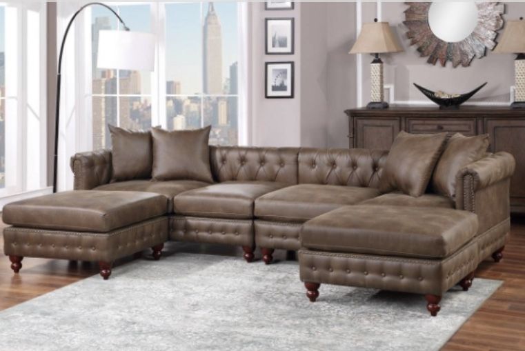 Sectional Sofa Item # 488 Color: Dark Coffee Material: Breathable Leatherette Dimensions: Sectional: 122″W x 65″L x 30″H Ottoman: 34″ x 31″ x 20″H Available in Dark Coffee and Slate Grey Some Assembly Required Includes: F8945 X 2 Chaise Lounge + F8946 X 2 Ottoman
