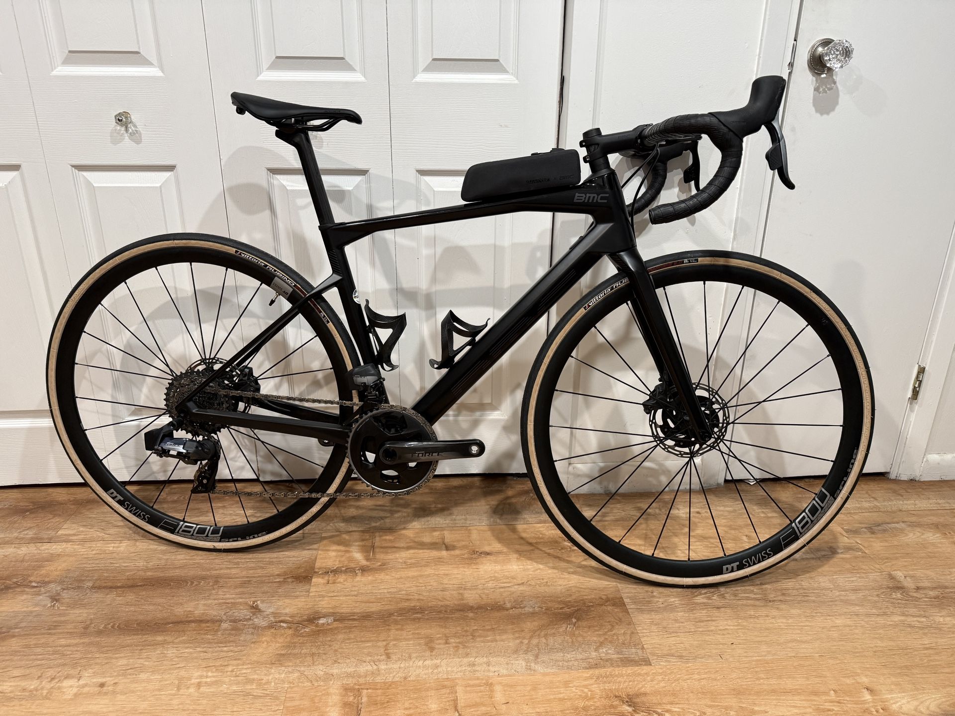 BMC Roadmachine TWO. Carbon Swiss frame. DT Swiss E1800 wheelset. SRAM force AXS 12 speed wireless shifting. Hydraulic disc brakes. $180 top tube bag included. Size 51 (5’5–5’9).
