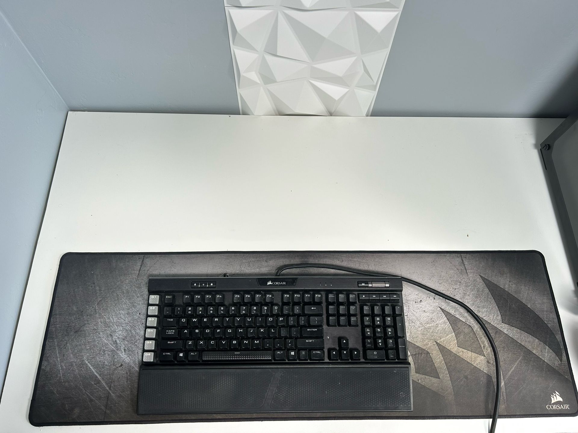 Corsair k95 RGB platinum( keyboard) very reliable keyboard didn’t have any problems with it. Full 100% sized keyboard; perfect for gaming and other uses. Corsair MM300 (Deskpad)- good material and aesthetically pleasing. I did cut a small hole in the Deskpad for the keyboard cable to pass through (can be seen in pictures)