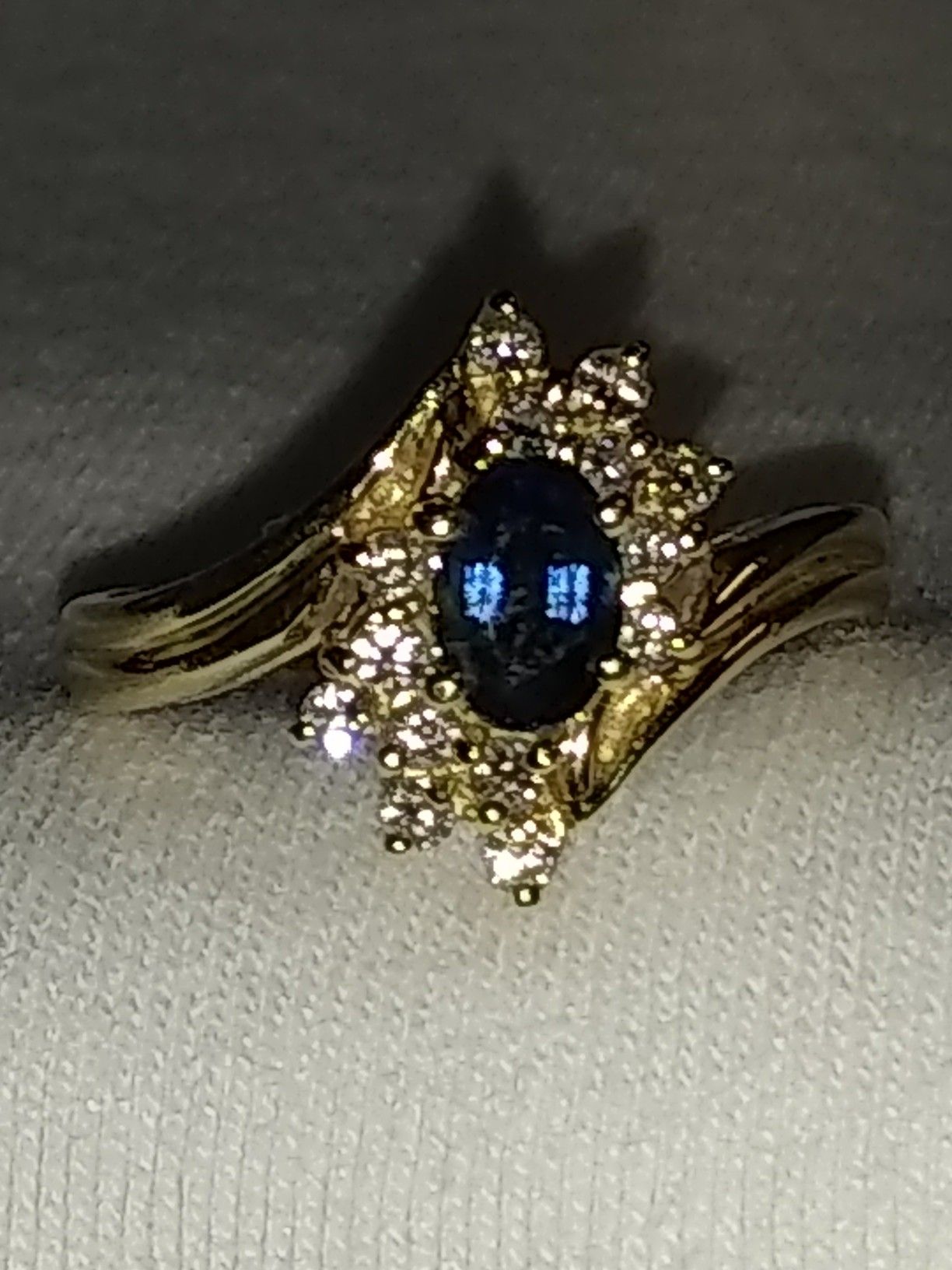 For sale is this beautiful Sapphire and Diamond ring. It is set in 14k gold and is a size 7 1/2 or 8. The pictures don't do it justice. Serious buyers only. Low ballers will be ignored.