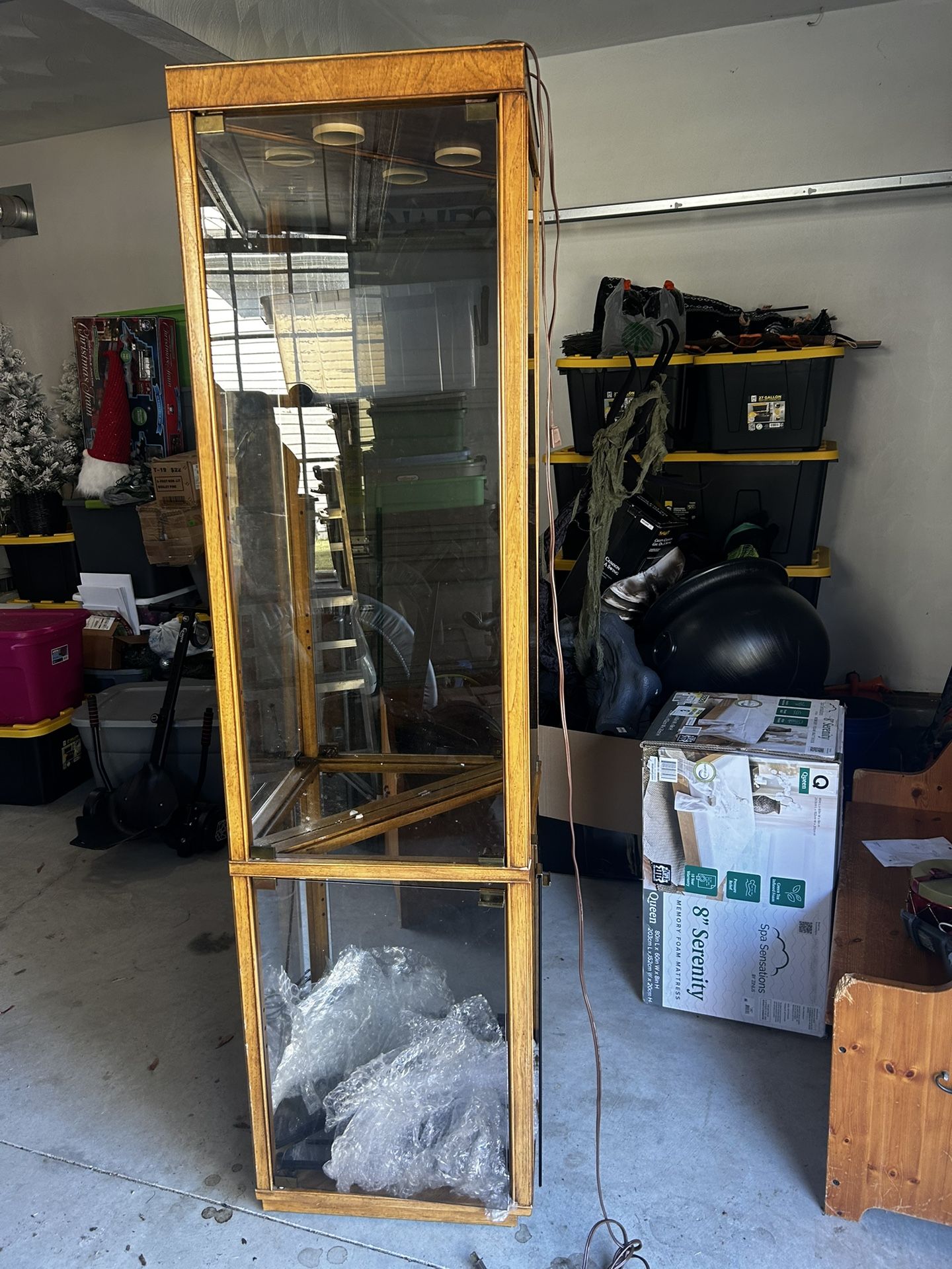 Used, comes with installed lighting. Wooden base, glass doors & metal closed doors. Mirror in the back of it. Need gone asap