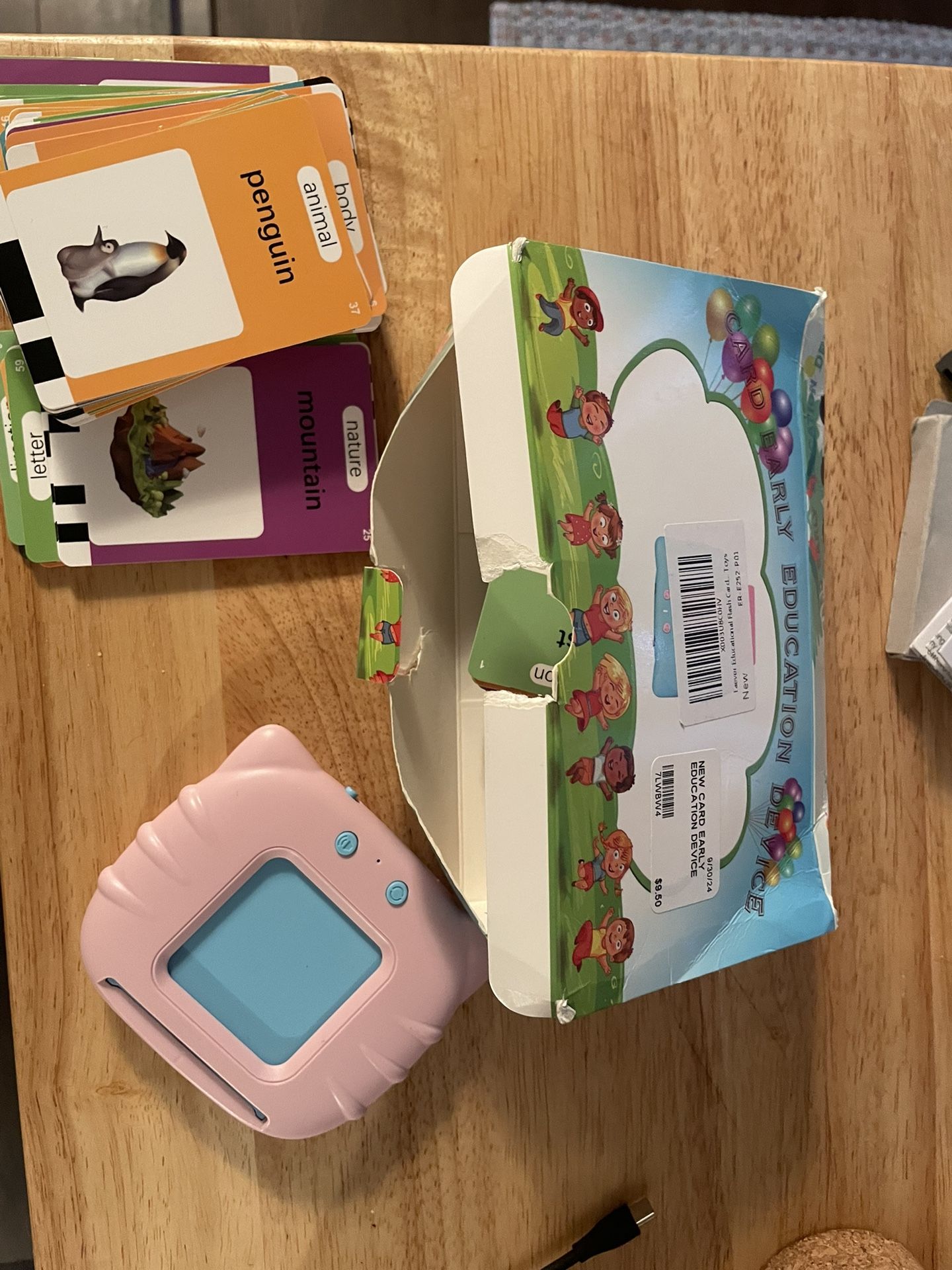 Really easy to use, no light up screen but instead just repeats the card. Multiple categories to pick from and comes with a charger. Really good for kiddos learning to talk