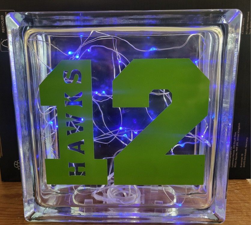 8x8x4 glass brick Green Seahawks 12 Decal with blue battery lights.