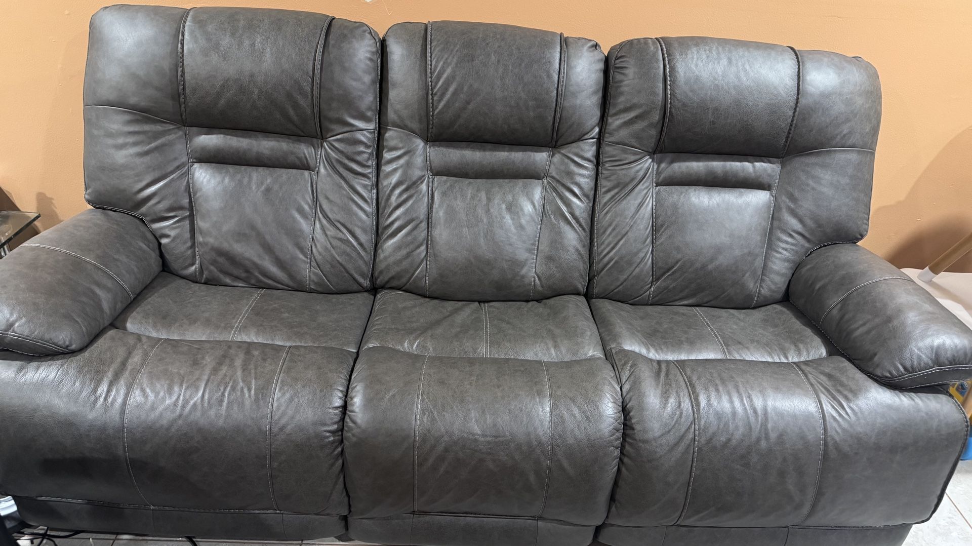 Dark brown leather sofa and love seat with electric button reclining Phone charging capability Cup holders Storage *super plush and comfortable, no rips.