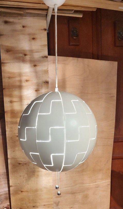 Collapsible hanging sphere light. Excellent condition, very cool! Color is white. 2 strings control position and shape . Pull one to close it to sphere. Which makes lighting warm and dim or pull The other string for fully open and brightest or choose dozens of other shapes &brightness levels in between.