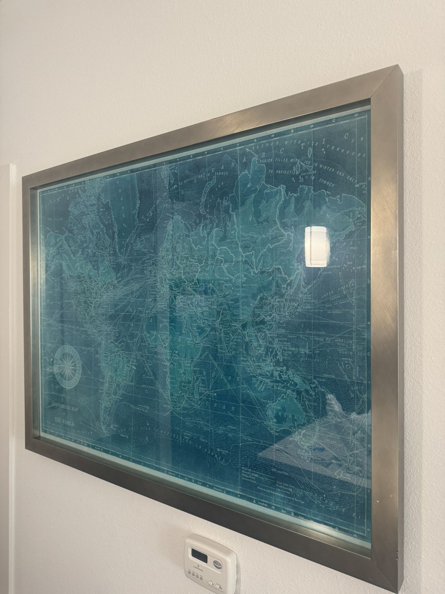 Description: Large framed world map wall art originally purchased from Z Gallerie. Features a vintage-style global map design in rich teal and blue tones with detailed linework. Professionally framed in a modern brushed metal frame that gives it a clean, upscale look. Perfect for a living room, office, bedroom, or entryway. Looks especially good in modern, contemporary, or coastal-inspired spaces. Details: • Brand: Z Gallerie • Style: Vintage / Modern / Global • Color: Teal, blue, metallic frame • Condition: Excellent, no damage • Ready to hang Originally paid a premium at Z Gallerie, selling due to movinf.