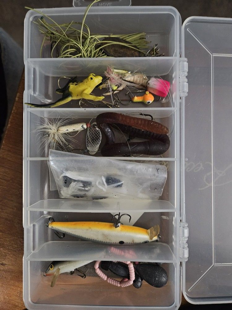 Comes as pictured, with a variety of rapalas worms frog spinner hooks etc etc.