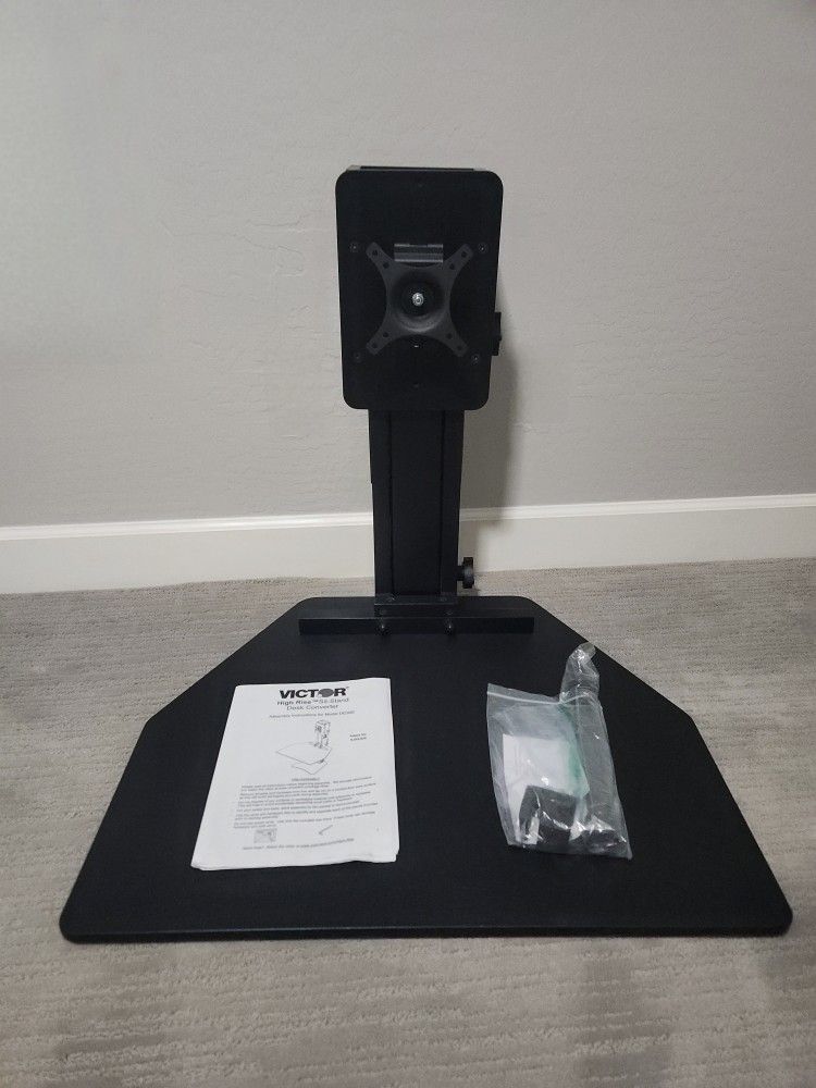 VICTOR® DC300 High Rise Adjustable Manual Single Monitor Standing Desk Converter – Sit-Stand Workstation Work Surface: 28” W x 23” D, raises up to 15.5” H Height Adjustment: 1” to 15.5” above desk Work Surface Weight Support: 20 lbs Monitor Capacity: 11 lbs (single VESA-mount monitor, height adjustable within 12.5” range) Material: Laminate-coated wood & steel Model Weight: 38.5 lbs Effortlessly convert any sit-down desk into a flexible sit-or-stand workspace with the VICTOR® DC300 High Rise Adjustable Manual Single Monitor Standing Desk Converter—the ideal solution for reducing sitting and enhancing ergonomic comfort in any office. The practical design allows users to position the work surface flush with the desk or raise it up to 15.5”, creating optimal placement for laptops, monitors, keyboards, and other daily essentials. Easy, knob-activated height control and smooth gas strut mechanism make switching between sitting and standing a breeze—while the large 28” x 23” desktop gives ample space for ergonomic computer setup, paperwork, or devices. The single monitor holder adjusts within a 12.5” range, supporting VESA-mount monitors weighing up to 11 lbs for personalized viewing comfort and productivity. Engineered to sit securely atop any desk or table with pads that prevent scratches, the DC300 features a heavy steel base to prevent tipping, ensuring stability and safety in any environment. With a durable, easy-to-clean laminate-coated surface, this manual sit-stand converter is designed for years of reliable daily use. Key Features & Benefits: Instantly converts any desk to an adjustable sit-stand workstation Large, ergonomic work surface for monitor, laptop, keyboard, and paperwork Smooth manual height adjustment (flush with desk up to 15.5”) VESA-compatible single monitor arm, height adjustable within 12.5” range Durable laminate wood & steel construction for lasting use Heavy steel base with scratch-preventing pads for stability No clamps, attachments, or permanent installation needed—just set on top Maximize comfort and productivity with the VICTOR® DC300 Sit-Stand Converter—engineered for healthy work habits and flexible office setups. $75 cash only. Pick up 83rd Avenue North of Happy Valley Rd. (Non-smoking home).