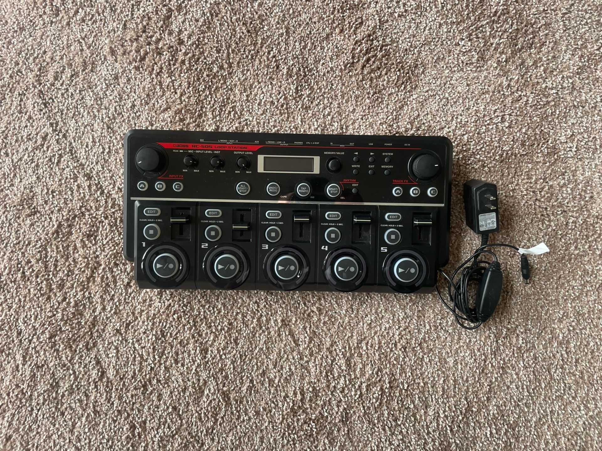 5 channel loop station Multi effect Mic (XLR) input Stereo instrument input Stereo output 📣 Read this Fader knob for the first channel broken, loop buttons work fine, and you can still regulate the volume, but the fader itself will come out. Everything else is fine, if you’ve used a similar loop station, you know this is not a big issue as you will most likely use a constant volume in your mix.