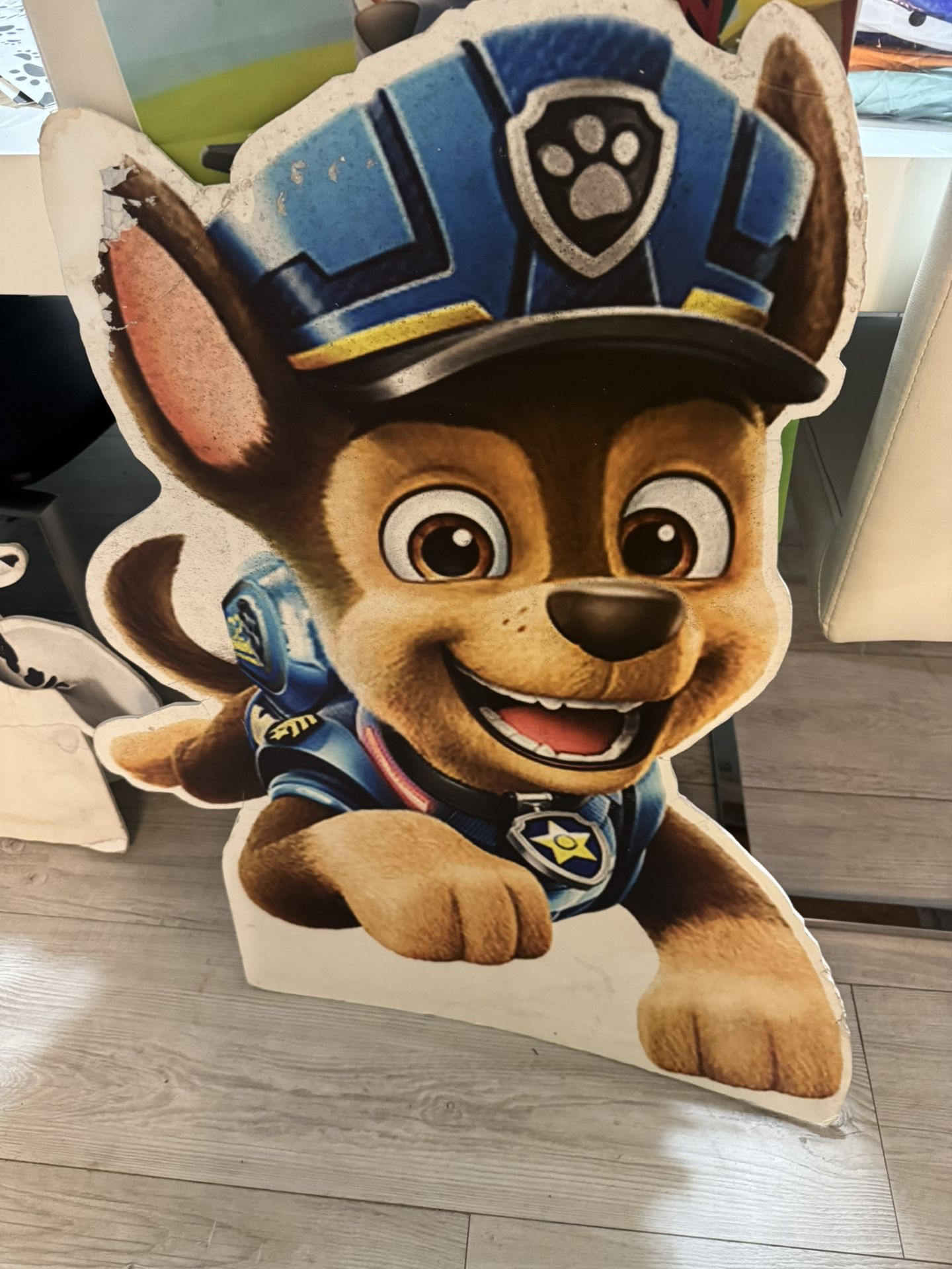 Two capes Large foam cut out of Marshall and Chase Six tablecloth with paw patrol colors, and doggy paws Eight Party Favor bags